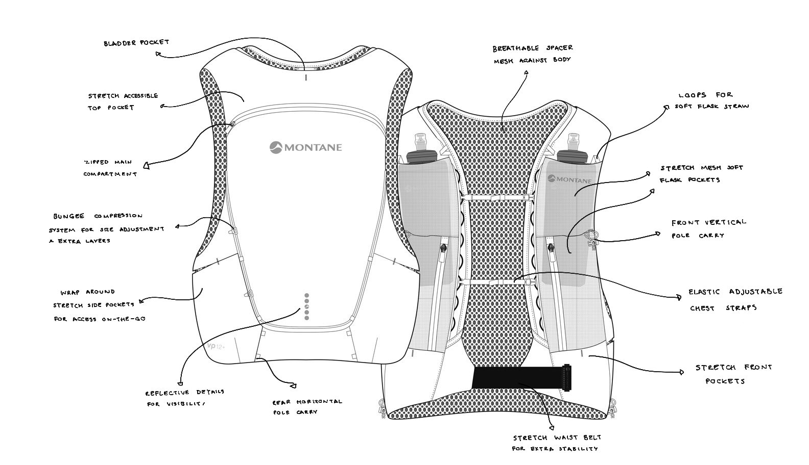 The Gecko packs come with a high stretch back pocket that can easily expand to accommodate more lightweight layers, whilst the addition of two soft flasks enables easy access to essential hydration on the move.