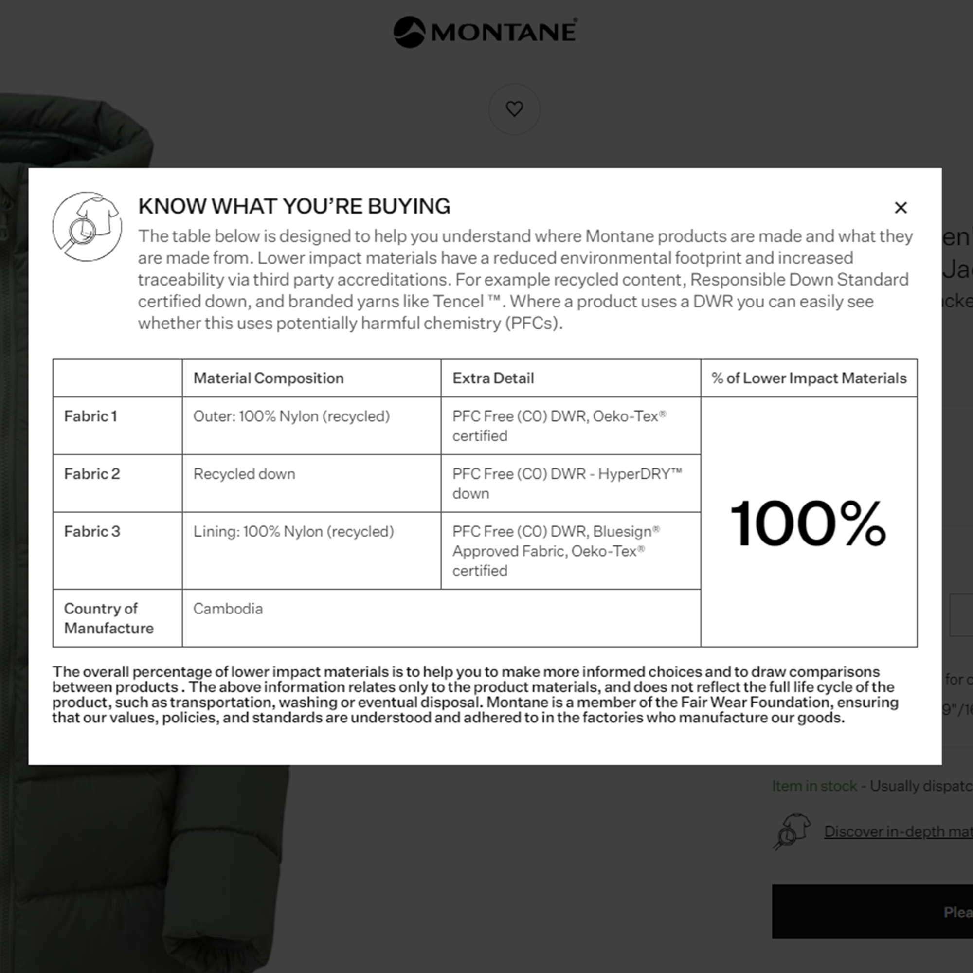 Our work towards increasing product transparency is ongoing, and we’re committed to keeping you informed along the way. As part of this, we know products can be complex, so we’re here to help you understand where Montane products are made and what they are made from. To help aid this understanding, look out for the ‘Know what you are buying’ icon on product pages on our site. When clicked this provides additional information about the product you are looking to buy, including lower impact materials.